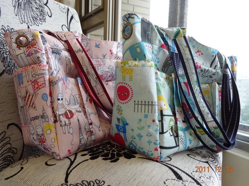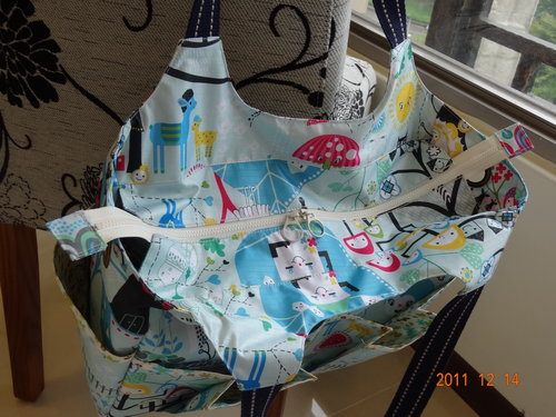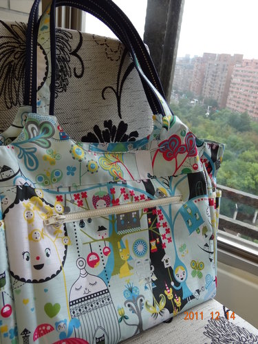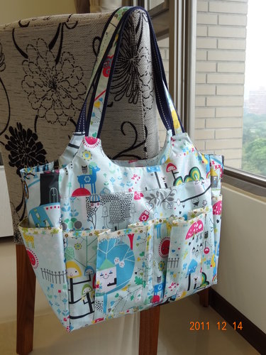 話說我的高中同學在2011年10月產下一女,雞婆的我自告奮勇說要幫她做一個媽媽袋(事實上我從來沒做過媽媽袋)。我同學非常簡明扼要說:要大、要防水、要可背可提。所以就變成這個樣子啦。