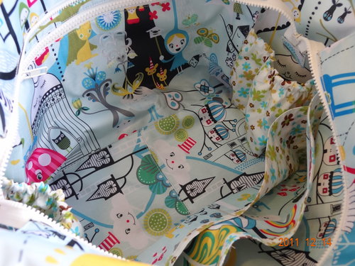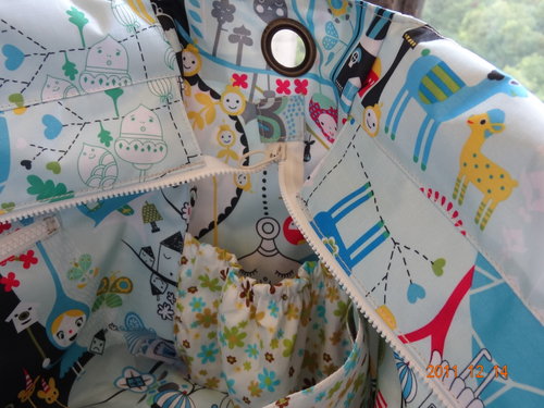重頭戲,媽媽袋內部構造,其實這是我在網路上參考眾家媽媽袋,and 受限於我的製作能力而來的。首先因為要防水,所以表裏用同一塊防水布製做,真是眼花撩亂。左右兩側是用棉布做的鬆緊口袋、前後兩面則是一個20公分的一字拉鍊口袋、另一面則是36公分寬的雙層貼式口袋(好像當媽媽的人都有很多東西要裝,還要放在不同的口袋裏,很難懂)