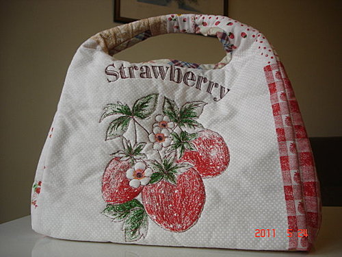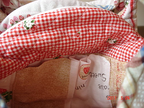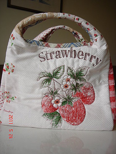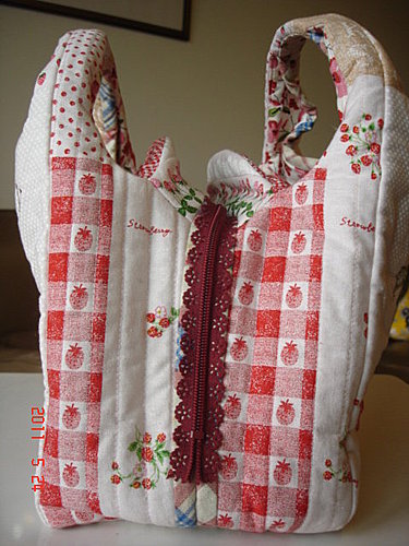 下方貼式口袋則是取另外一種草苺布做。忍不住再說一次,這塊布真神奇,好像天生就是生來做三層包似的,每個位置都可以配合不同圖案布