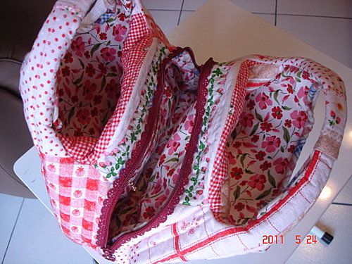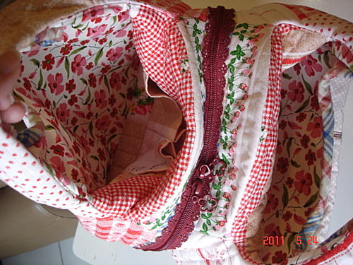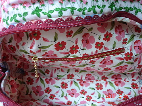 這是中間蕾絲拉鍊打開的樣子,裏布的小紅花讓整個包包變得更活潑